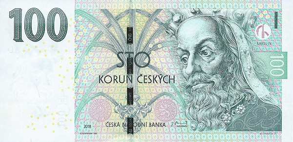 - 100 крон: Монархия и государственность. На самой ходовой банкноте — портрет короля Карла IV, императора Священной Римской империи и отца-основателя Карлова университета. На оборотной стороне — медальон с изображением государственной печати.