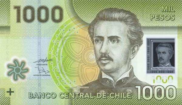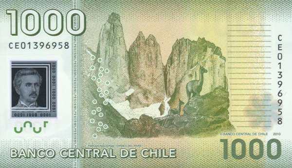 - 1000 песо (зелёная): На лицевой стороне — портрет Игнасио Карреры Пинто, капитана, героя Тихоокеанской войны. На обороте — величественные горные пики Торрес-дель-Пайне в одноимённом национальном парке и гуанако.