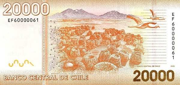 - 20 000 песо (оранжевая): Самая крупная купюра несёт портрет Андреса Бельо, выдающегося гуманиста и педагога. На обороте — здание Национальной библиотеки в Сантьяго.