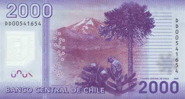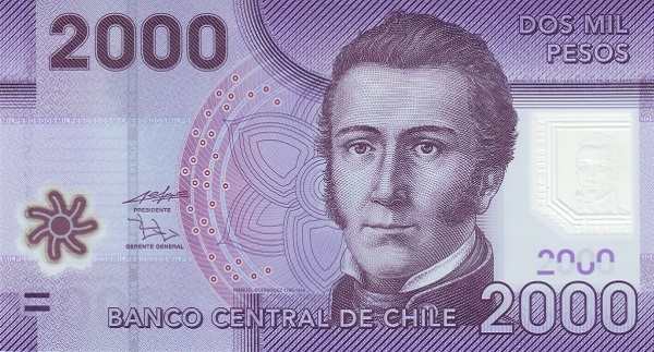 - 2000 песо (фиолетовая): Посвящена Мануэлю Родригесу Эрдоисе, легендарному партизану и герою войны за независимость. На обороте изображены чилийские пампасные степи.