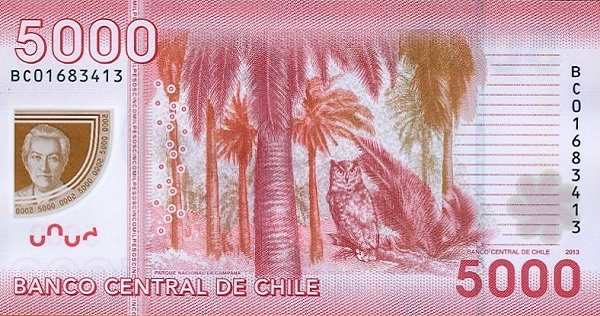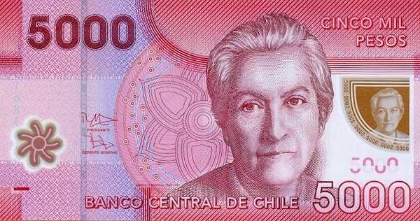 - 5000 песо (красная): Украшена портретом Габриэлы Мистраль, лауреата Нобелевской премии по литературе, что делает эту купюру особо уникальной. На обороте — пейзажи долины Эльки.