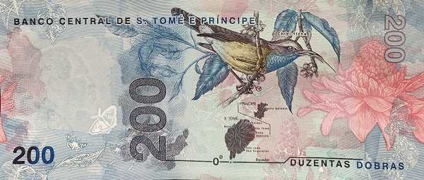 - 200 добр (зелено-розовые) — портрет Рея Амадора и принсипийская нектарница и герб Сан-Томе и Принсипи