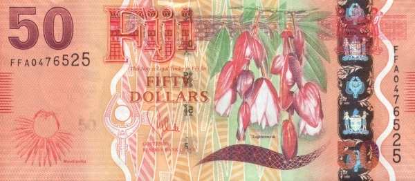 - 50 долларов: Одна из самых красивых банкнот. На ней изображена знаменитая орхидея «Tagimoucia» (тигимоуция), которая растет только на склонах вулкана на острове Тавеуни и стала национальным цветком Фиджи.