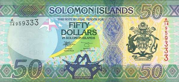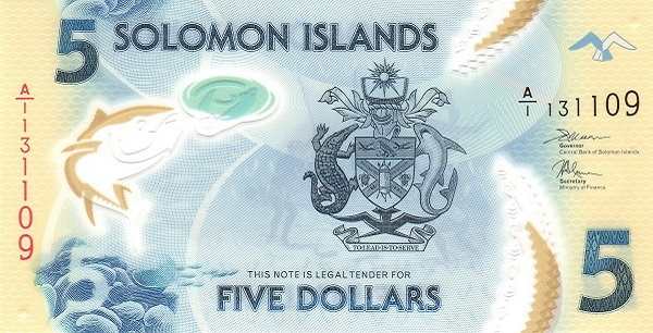 | SI$5 | Синий | Национальный герб / Проа (традиционная лодка) | Символизирует важность моря, рыболовства и путешествий между островами. |