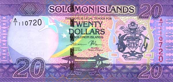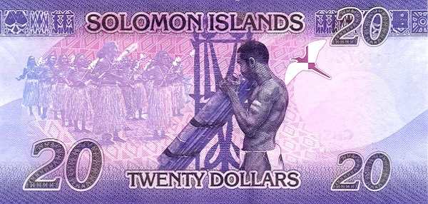 | SI$20 | Коричневый | Национальный герб / Воины с копьями и щитами | Отсылает к воинской истории и традициям островов, богатых легендами. |