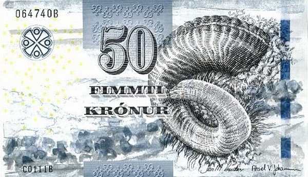 | 50 крон | Серый, синий | Рог барана | Обрыв на острове Сувурой | Символизирует важность овцеводства |