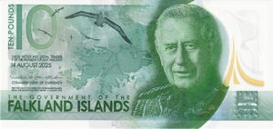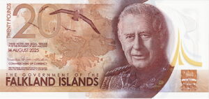 Однако в 2025 году произошло важное нововведение. В августе 2025 года Фолклендские острова выпустили новую полимерную банкноту номиналом 5 фунтов. Этот выпуск стал первым изменением дизайна банкнот за более чем 40 лет. На лицевой стороне новой купюры изображен король Чарльз III, а также чернобровые альбатросы и королевские пингвины. На оборотной стороне изображение национального цветка — бледной девы, острова Стиипл Джейсон и пять видов пингвинов. Власти островов отмечают, что новый дизайн, разработанный совместно с производителем De La Rue и рабочей группой местных жителей, отдаёт дань уважения уникальному наследию и животному миру Фолклендов.