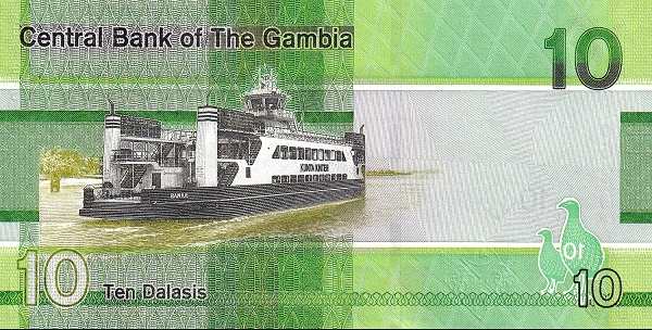 - 10 даласи (зеленая): украшена парой голубей (один из которых летит), а на обороте — паром «Kunta Kinteh», курсирующий между городами.