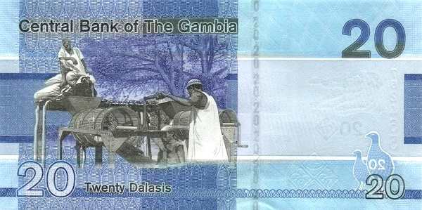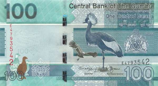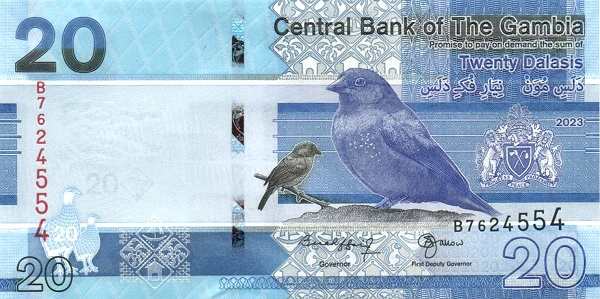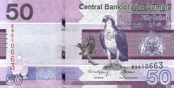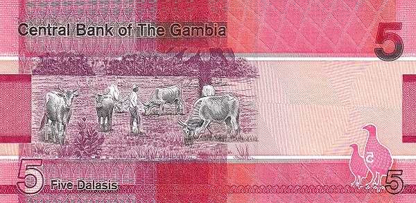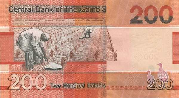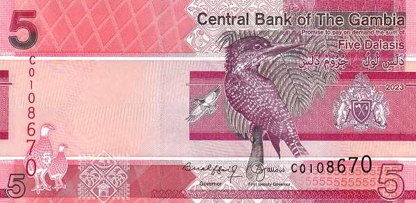 - Банкноты. В обращении находятся купюры номиналом 5, 10, 20, 25, 50, 100 и 200 даласи образца 2015 года и более поздние выпуски. Их дизайн — это гармоничное сочетание портретов жителей Гамбии, изображений национальных птиц и значимых архитектурных объектов.