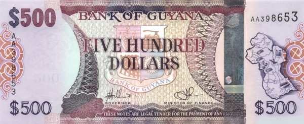 - 500 гайанских долларов. На банкноте запечатлено здание Национальной ассамблеи (Парламента) — сердце политической жизни страны.