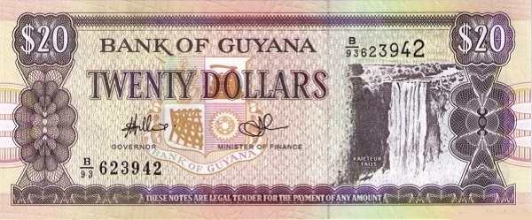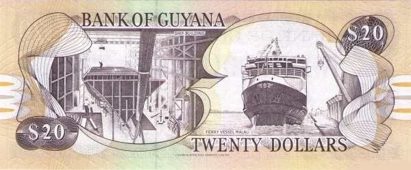 - 20 гайанских долларов. Чаще всего встречается в повседневных расчетах. На оборотной стороне изображены портовые сооружения столицы — Джорджтауна, что символизирует связь страны с внешним миром через торговлю.