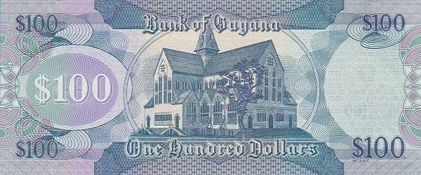 - 100 гайанских долларов. Один из самых распространенных номиналов. Украшена изображением величественного кафедрального собора Св. Георгия в Джорджтауне — одного из самых высоких деревянных соборов в мире и важного исторического памятника.
