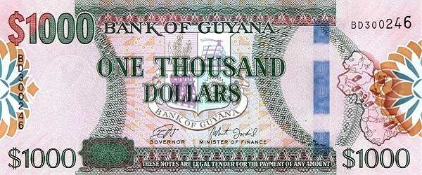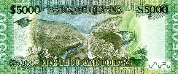 - 5000 гайанских долларов. Крупнейший номинал. Его дизайн воспевает главное богатство Гайаны — девственную природу: здесь изображены горы, реки и птицы тропических лесов.