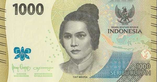 - Rp 1,000 (жёлто-серая): Героиня Кут Ниак Мётия с острова Ачех, прославившаяся сопротивлением колонизаторам. На обороте — танец Тифа и острова Банда.