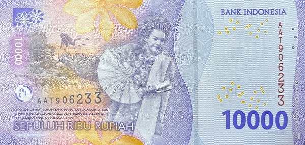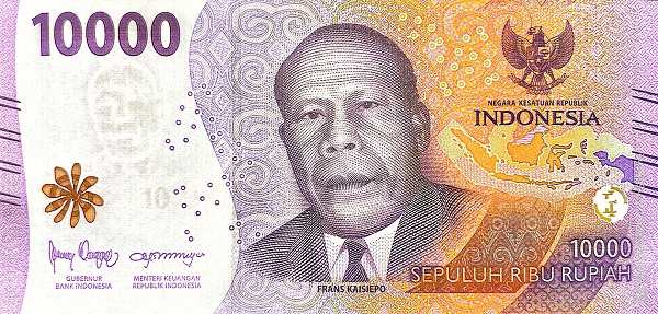 - Rp 10,000 (фиолетовая): Франс Кайсиепо, борец за присоединение Западного Папуа. На обороте — танец Пакарена и национальный парк Вакатоби.