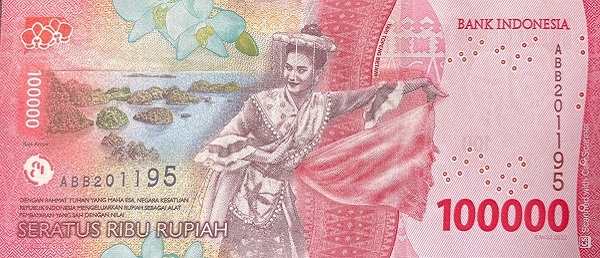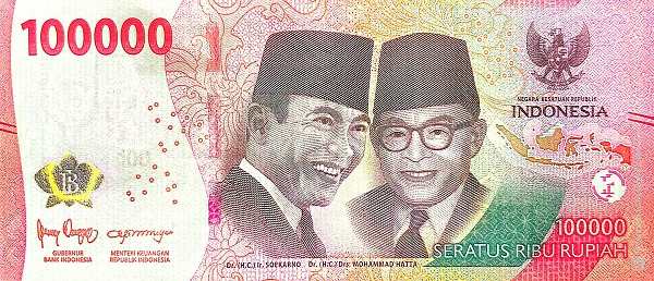 - Rp 100,000 (красная): Дуэт отцов-основателей — Сукарно и Мохаммад Хатта, провозгласившие независимость. На обороте — танец Топенг Бетави и архипелаг Раджа-Ампат.
