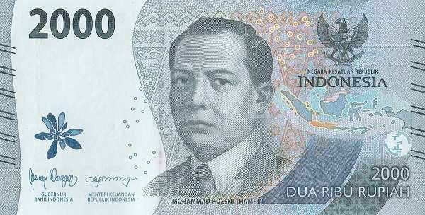 - Rp 2,000 (серая): Портрет Мохаммада Хусни Тамрина, борца за независимость. На обороте — танец Пиринг и долина Сьянок.