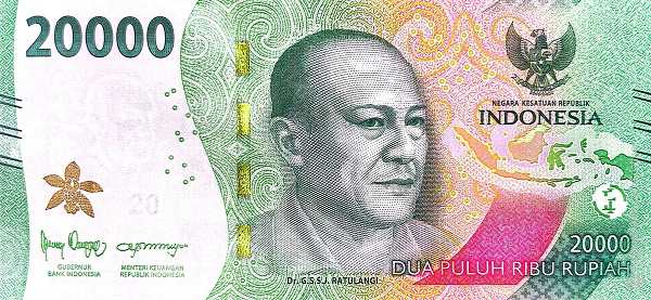- Rp 20,000 (светло-зелёная): Сам Ратуланги, провозгласивший принцип «единство в разнообразии». На обороте — танец Гонг и острова Дераван.