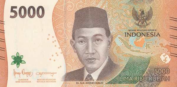 - Rp 5,000 (светло-коричневая): Идхам Халид, государственный деятель. На обороте — танец Гамбён и вулкан Бромо.