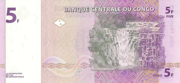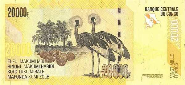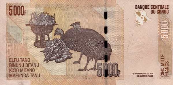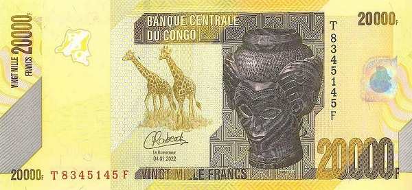 Банкноты конголезского франка — это настоящая галерея, отражающая природное богатство, культурное наследие и экономический потенциал ДРК. В обращении находятся купюры номиналом 50, 100, 200, 500, 1000, 5000, 10 000 и 20 000 франков. Мелкие номиналы (1, 5, 10, 20 и 50 сантимов) практически вышли из употребления из-за низкой покупательной способности.