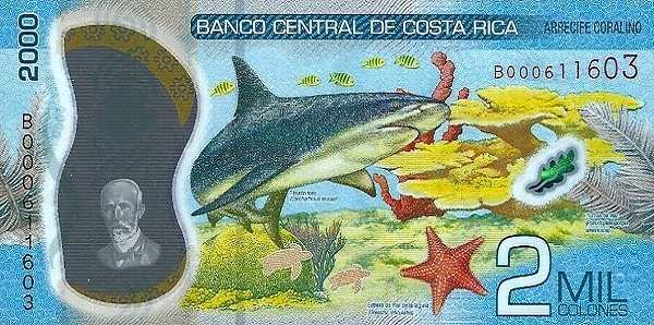 - 2000 колонов: Синяя банкнота с портретом политика и юриста Мауро Фернандеса Акуньи. На обороте изображена бычья акула.