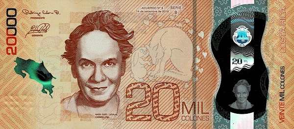 - 20000 колонов: На этой купюре изображена писательница Мария Изабель Карвахаль.
