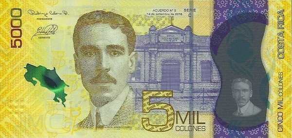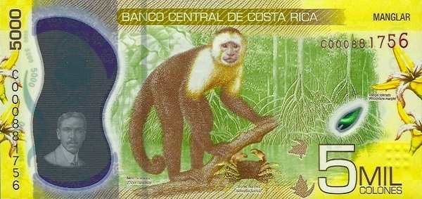 - 5000 колонов: Желтая купюра, посвященная президенту Альфредо Гонсалесу Флоресу. Оборотная сторона украшена изображением обезьяны-капуцина.