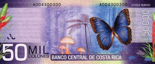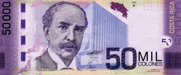 - 50000 колонов: Банкнота высшего номинала с портретом президента Рикардо Хименеса Оримуно. Стоит отметить, что с 2020 года эта купюра постепенно изымается из оборота из-за значительного количества подделок и небольшого спроса на такой высокий номинал среди населения.