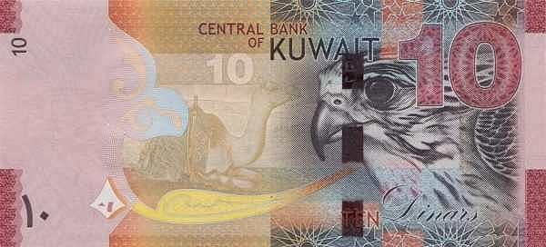 - 10 динаров (10 KD) — Красный/Розовый — Здание Национального собрания, парусник «Самбук» — Сокол и верблюд с традиционным седлом «саду».