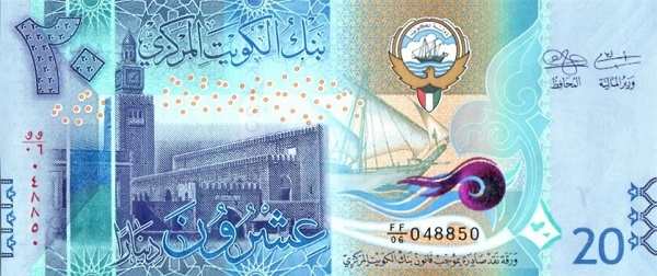 - 20 динаров (20 KD) — Синий — Дворец Сейф (Seif Palace), парусник «Бум» — Ловец жемчуга и традиционная кувейтская парусная лодка «Бум».