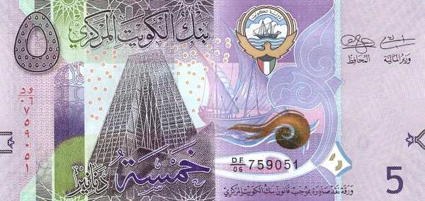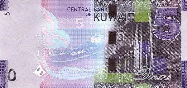 - 5 динаров (5 KD) — Пурпурный — Здание Центрального банка Кувейта, парусник «Батыл» — Нефтеперерабатывающий завод и нефтяной танкер.