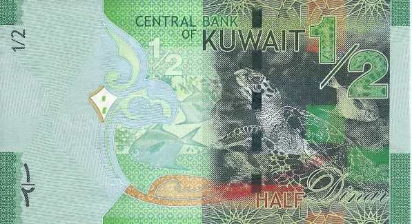 - 1/2 динара (½ KD) — Зеленый — Кувейтские башни, парусник «Шуи» — Зеленая морская черепаха и рыба «зубади» (серебристый помфрет).