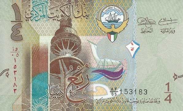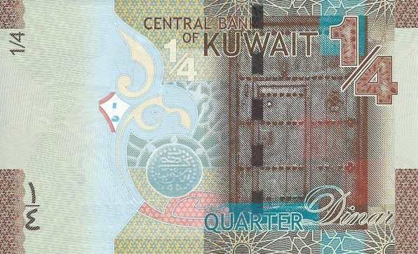 - 1/4 динара (¼ KD) — Коричневый — Башня Освобождения (Liberation Tower), парусник «Тишала» — Традиционная деревянная кувейтская дверь, первая кувейтская монета.