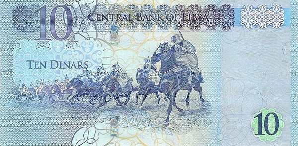 - 10 динаров: Основные цвета — зелёный; Изображения на лицевой стороне — портрет Омара аль-Мухтара; Изображения на оборотной стороне — всадники аль-Мухтара