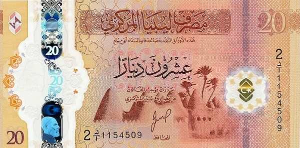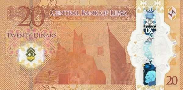 - 20 динаров: Основные цвета — оранжевый; Изображения на лицевой стороне — мечеть Аль-Атика в городе Адждабия — один из самых известных исламских архитектурных памятников страны; Изображения на оборотной стороне — крепость в Гадамесе