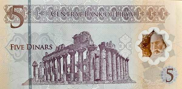 - 5 динаров: Основные цвета — коричневый, красный; Изображения на лицевой стороне — Османская башня с часами; Изображения на оборотной стороне — Храм Зевса в Кирене