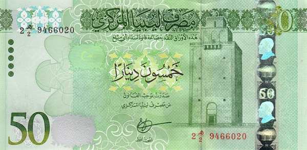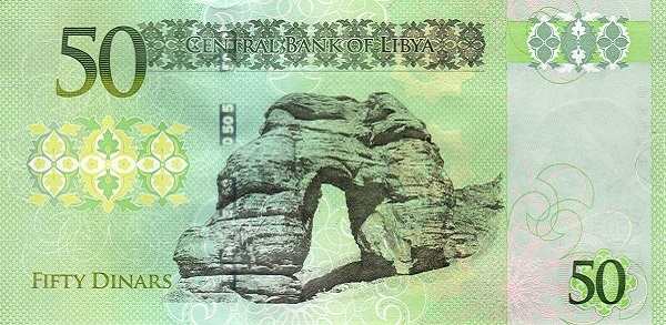 - 50 динаров: Основные цвета — зелёный, коричневый; Изображения на лицевой стороне — итальянский маяк в Бенгази; Изображения на оборотной стороне — скальные образования в Тадрарт-Акакус
