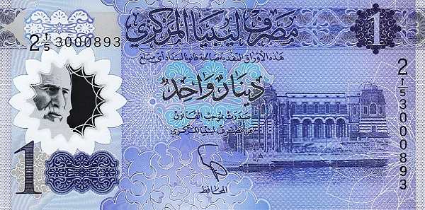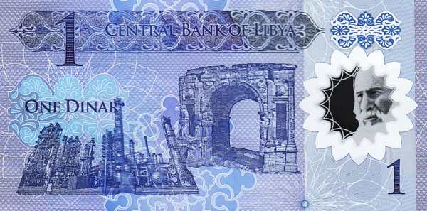 - 1 динар: Основные цвета — синий, голубой; Изображения на лицевой стороне — здание Центрального банка в Триполи; Изображения на оборотной стороне — нефтеперерабатывающий завод и античная арка Аврелия