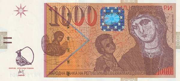 - 1000 денаров: «Мадонна Эпискепсис» (церковь Святого Врача Мали, Охрид).
