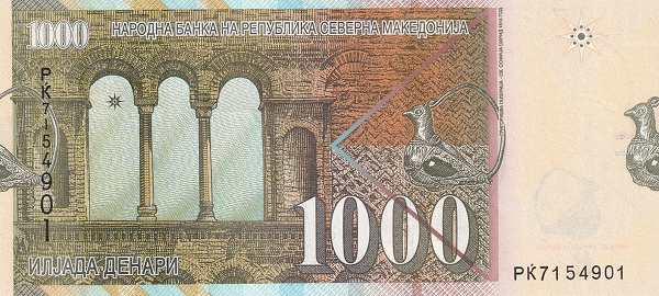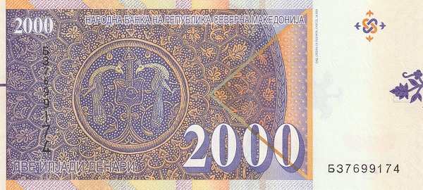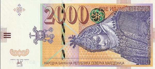 - 2000 денаров (самая крупная купюра): бронзовый артефакт в форме чашки с маком (обнаружен в Сува-Реке, Гевгелия) и македонское свадебное платье из Прилепа.