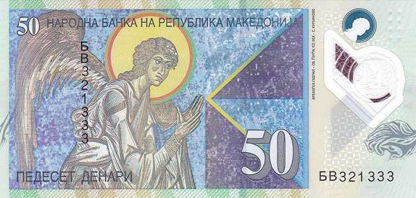 - 50 денаров: фоллис императора Анастасия I на фоне декоративной арки из церкви св. Пантелеймона в Нерези и архангел Гавриил с фрески из церкви св. Георгия в Курбиново.