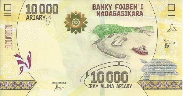 - 10 000 ариари: Основные цвета — жёлтый, зелёный; Изображение на лицевой стороне — валиха; Изображение на оборотной стороне — грузовое судно, идущее в порт