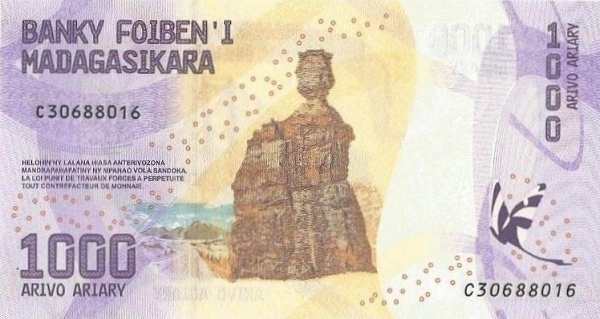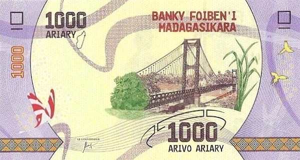 - 1000 ариари: Основные цвета — фиолетовый, жёлтый; Изображение на лицевой стороне — подвесной мост через Махаджамбу; Изображение на оборотной стороне — национальный парк Исалу