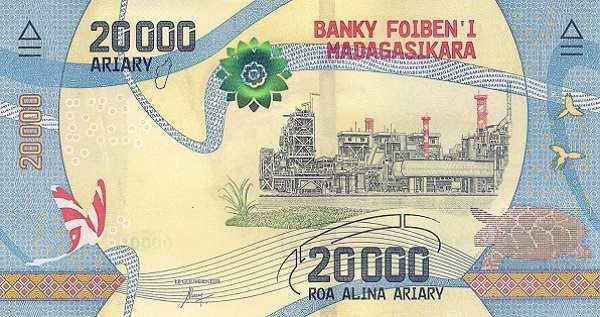 - 20 000 ариари: Основные цвета — синий, зелёный; Изображение на лицевой стороне — ваниль, личи и рис; Изображение на оборотной стороне — никелевый завод «Ambatovy»