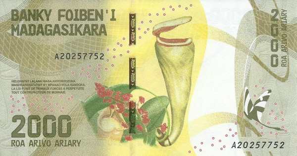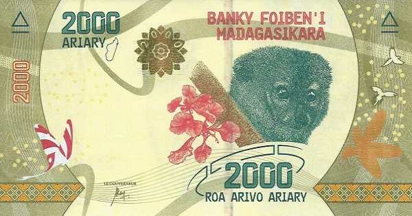 - 2000 ариари: Основные цвета — зелёный, жёлтый; Изображение на лицевой стороне — кошачий лемур; Изображение на оборотной стороне — непентес