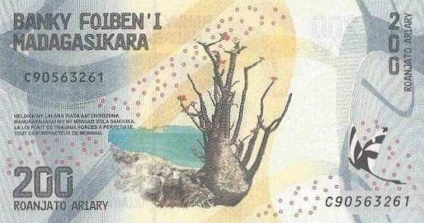 - 200 ариари: Основные цвета — серый, жёлтый; Изображение на лицевой стороне — бонтака на фоне океана; Изображение на оборотной стороне — янтарный водопад в национальном парке Монтань д’Амбр, катарантус розовый