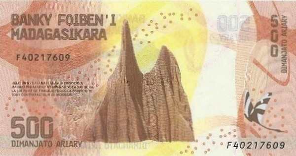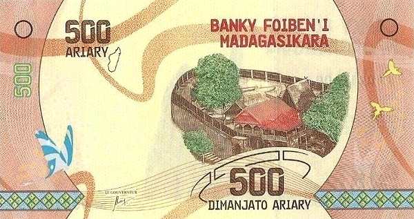 - 500 ариари: Основные цвета — коричневый, жёлтый; Изображение на лицевой стороне — Амбухиманга; Изображение на оборотной стороне — красные цинги