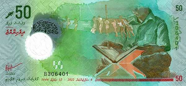 - 50 руфий (зеленые): мужчины, вытаскивающие лодки с пляжа на воду, и мальчик, читающий Коран