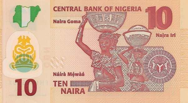 - 10 найр: Украшена портретом доктора Алвана Икоку (1900–1971) — выдающегося нигерийского педагога и борца за права народа игбо. На обороте — женщины народа фулани, несущие на головах сосуды для молока.