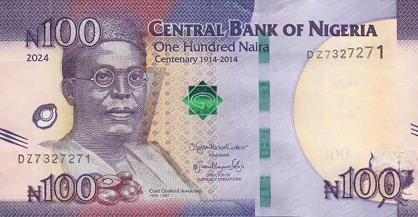 - 100 найр: Посвящена Обафеми Аволово — не только тому самому политику, который предложил название «найра», но и виднейшему деятелю национально-освободительного движения. На обороте — величественная скала Зума.